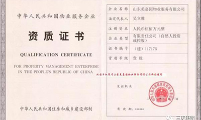 3月2017年3月23日,山東美嘉園物業(yè)服務(wù)有限公司由二級資質(zhì)晉升為一級資質(zhì)。