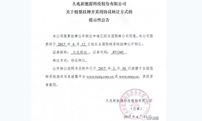 4月2017年4月12日三慶集團(tuán)控股的久兆新能源科技股份有限公司在“新三板”掛牌上市,證券簡稱:久兆科技,證券代碼:871345。